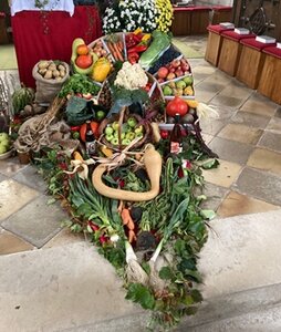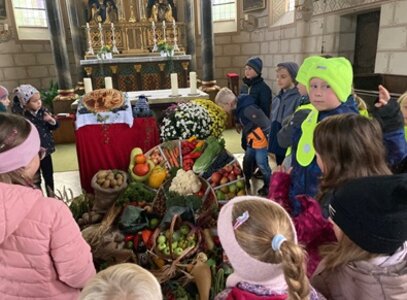 Am 8.10.2025 besuchten die katholischen Kinder der Klasse 1b die Kirche und bestaunten den Erntedankaltar.