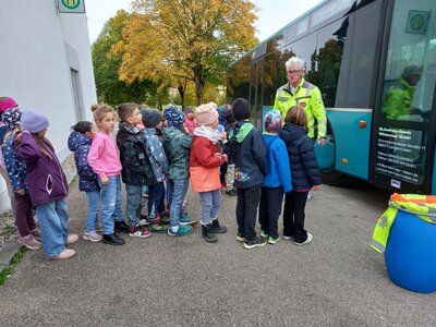 Wie man sich bei der Fahrt mit dem Schulbus richtig verhält, lernten die Kinder der 1. Klassen bei einem Schulbustraining am 13.10.25. Begleitet wurden sie dabei von der Tonne „Maxl“. Durch diese wurde den Kindern veranschaulicht, was z.B. bei einer Vollbremsung passiert, wenn man nicht angeschnallt ist.
